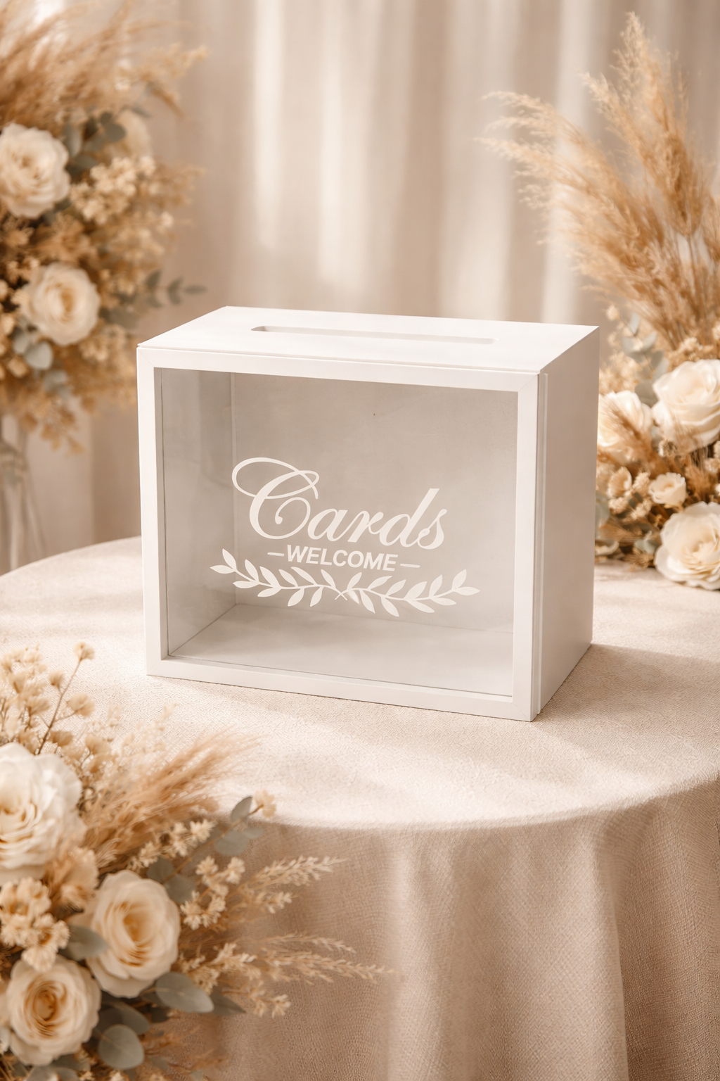 Stijlvolle en duurzame trouwkaartdoos van hout met een transparant acrylvenster. Ideaal voor het verzamelen van kaarten, enveloppen en geldcadeaus tijdens bruiloften en andere feestelijke gelegenheden.