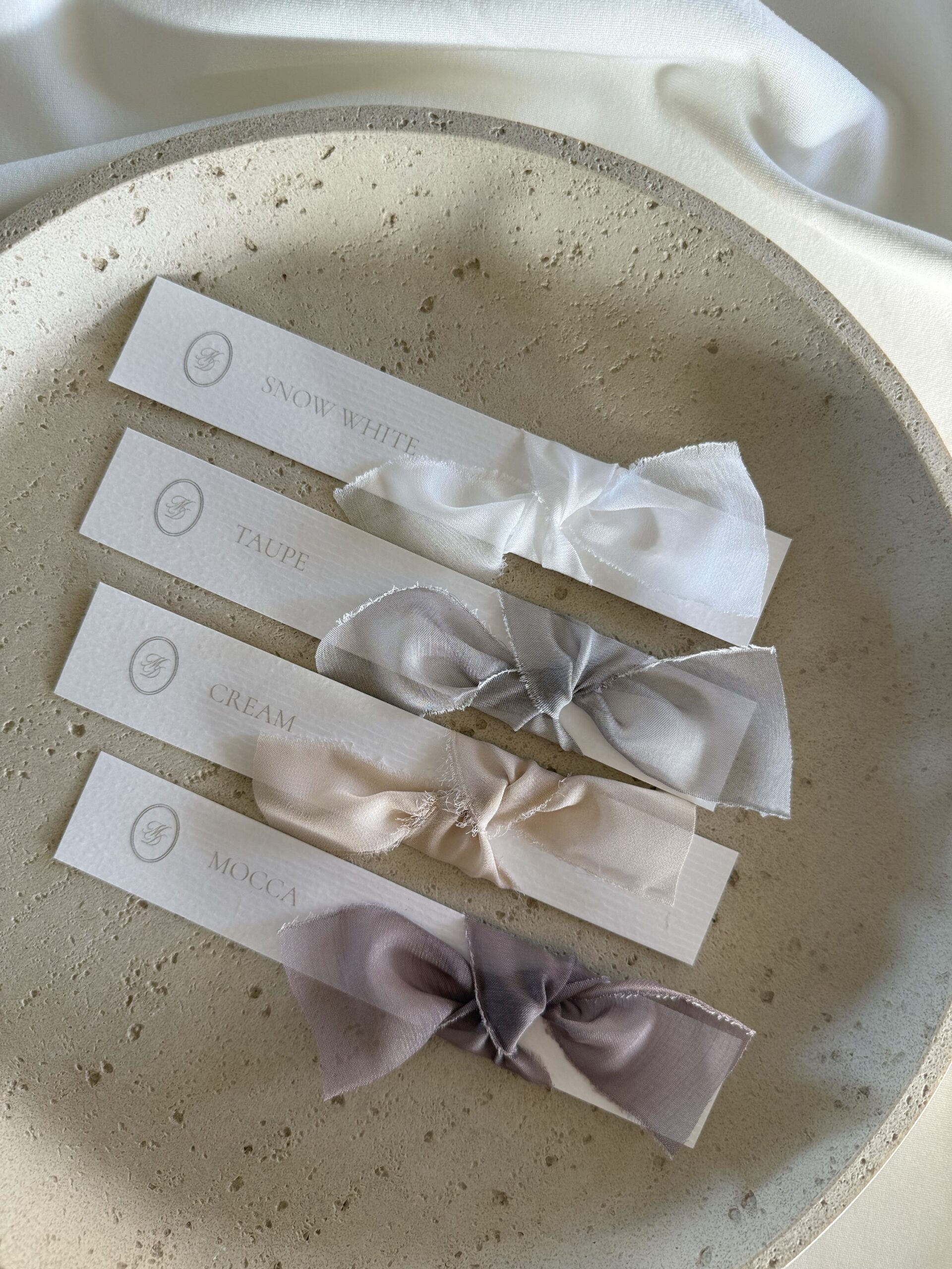 De standaard uitvoering is voorzien van een taupe strik, maar je kunt ook kiezen uit andere kleuren zodat de tafelkaartjes perfect aansluiten bij het kleurenthema van jouw evenement.