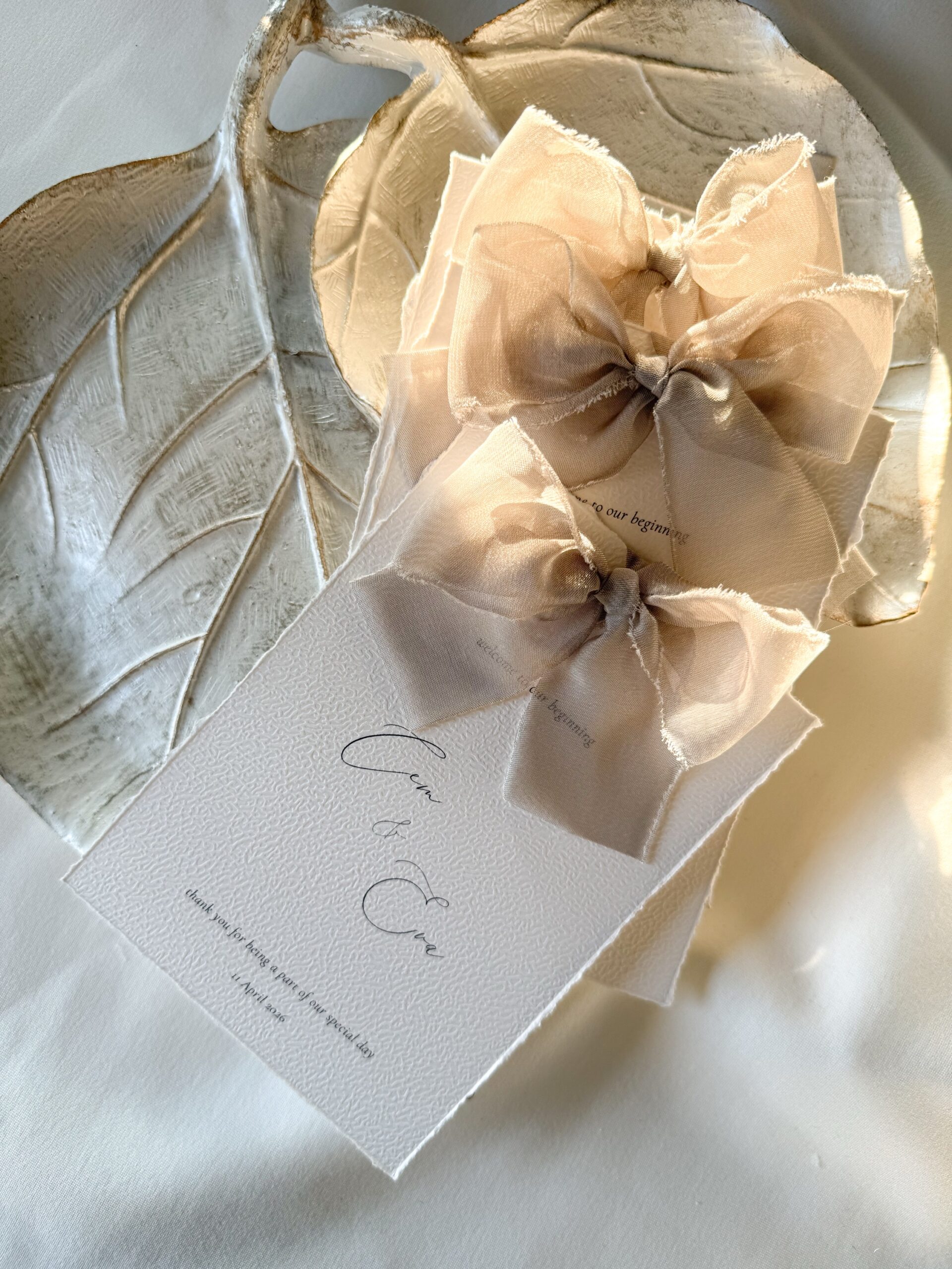 Geef jouw tafelsetting een stijlvolle en persoonlijke uitstraling met deze handgemaakte tafelkaart met elegante taupe strik. Perfect voor bruiloften, verlovingen, diners en andere feestelijke gelegenheden. De zachte taupe kleur geeft een warme en luxe uitstraling en past prachtig bij zowel moderne als romantische decoraties.