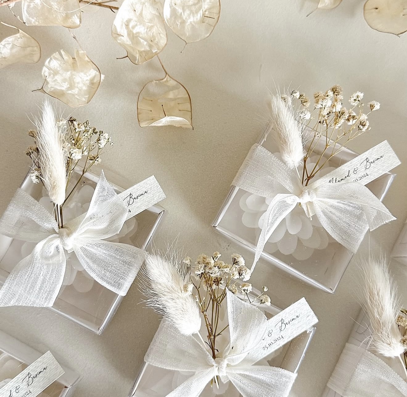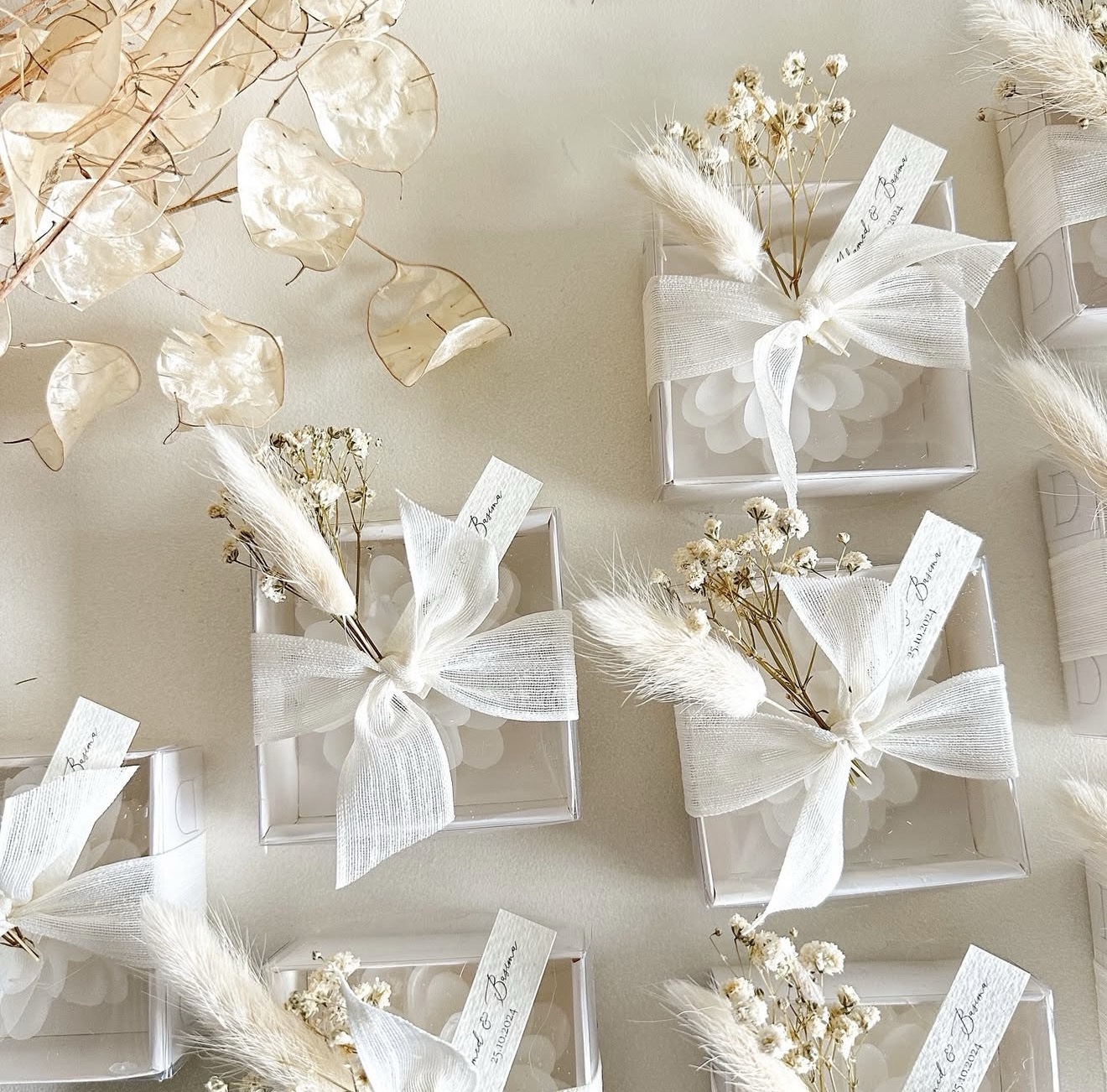 Deze elegante kaarsbedankjes zijn een prachtige herinnering aan een bijzondere dag. De kaars wordt geleverd in een wit doosje met transparante deksel en is afgewerkt met een fijne witte strik, natuurlijke droogbloemen en een naamkaartje. Minimalistisch, tijdloos en perfect voor een romantische setting.