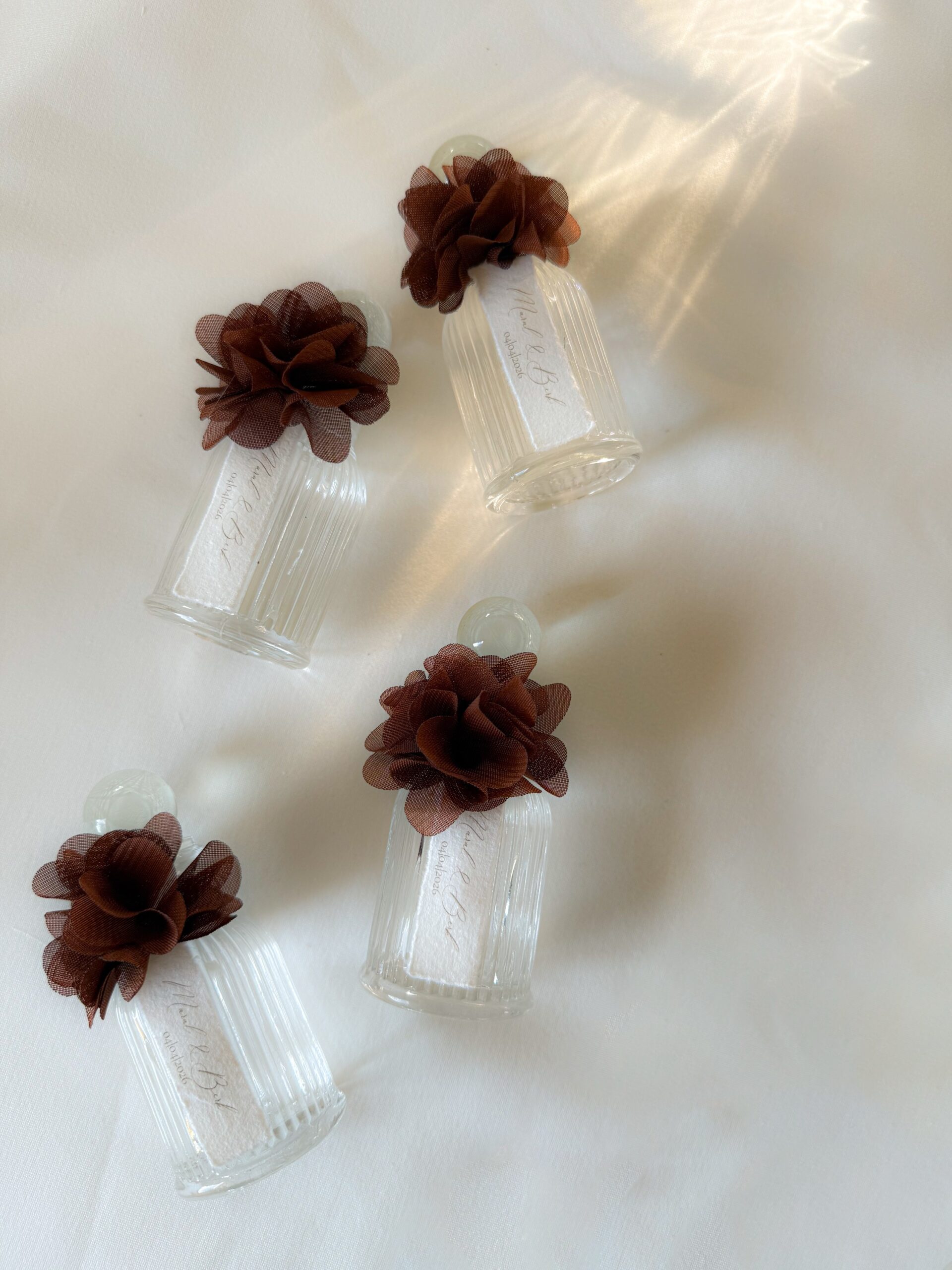 Stijlvolle kolonya flesjes van glas met een elegante ribbelstructuur. De dop is afgewerkt met bruine bloemen en elk flesje wordt geleverd met een persoonlijk naamkaartje. Perfect als bedankje voor een geboorte, babyshower, bruiloft, verloving of andere speciale gelegenheid.