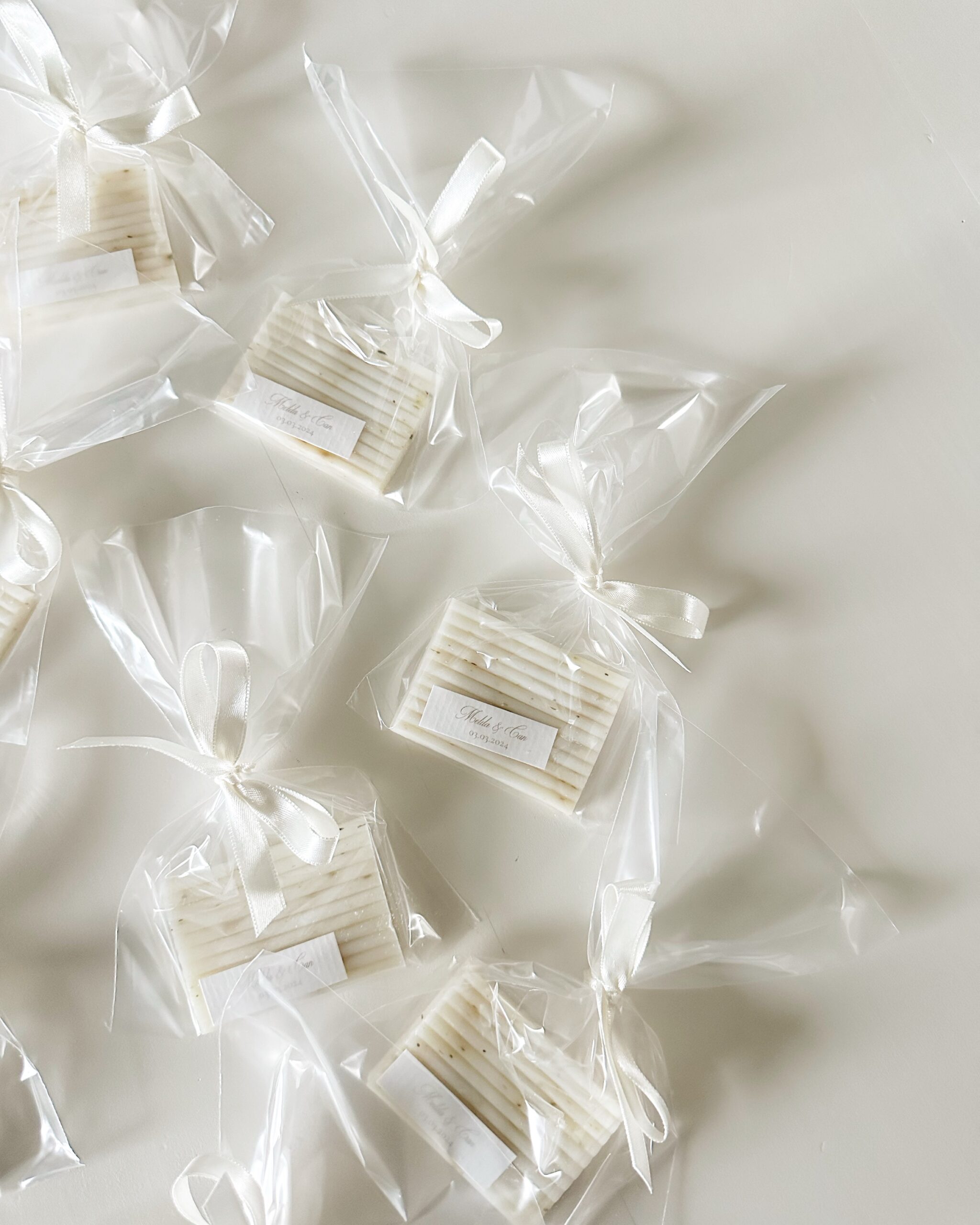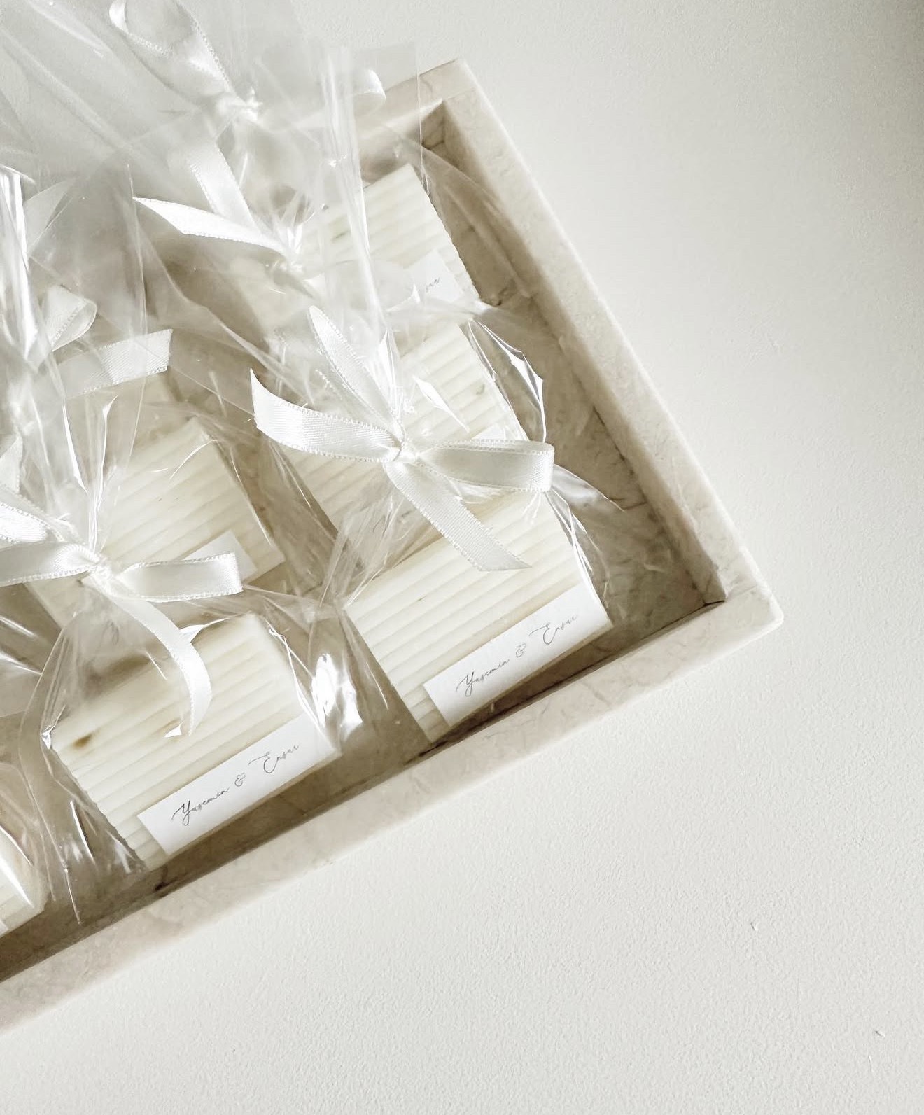 Deze elegante mini vierkante zeep is gemaakt van traditionele hamam witte zeep en heeft een frisse citrusgeur. Elke zeep is individueel verpakt in een transparant zakje en afgewerkt met een satijnen lint en een naamkaartje, wat het perfect maakt als geschenk voor speciale gelegenheden.