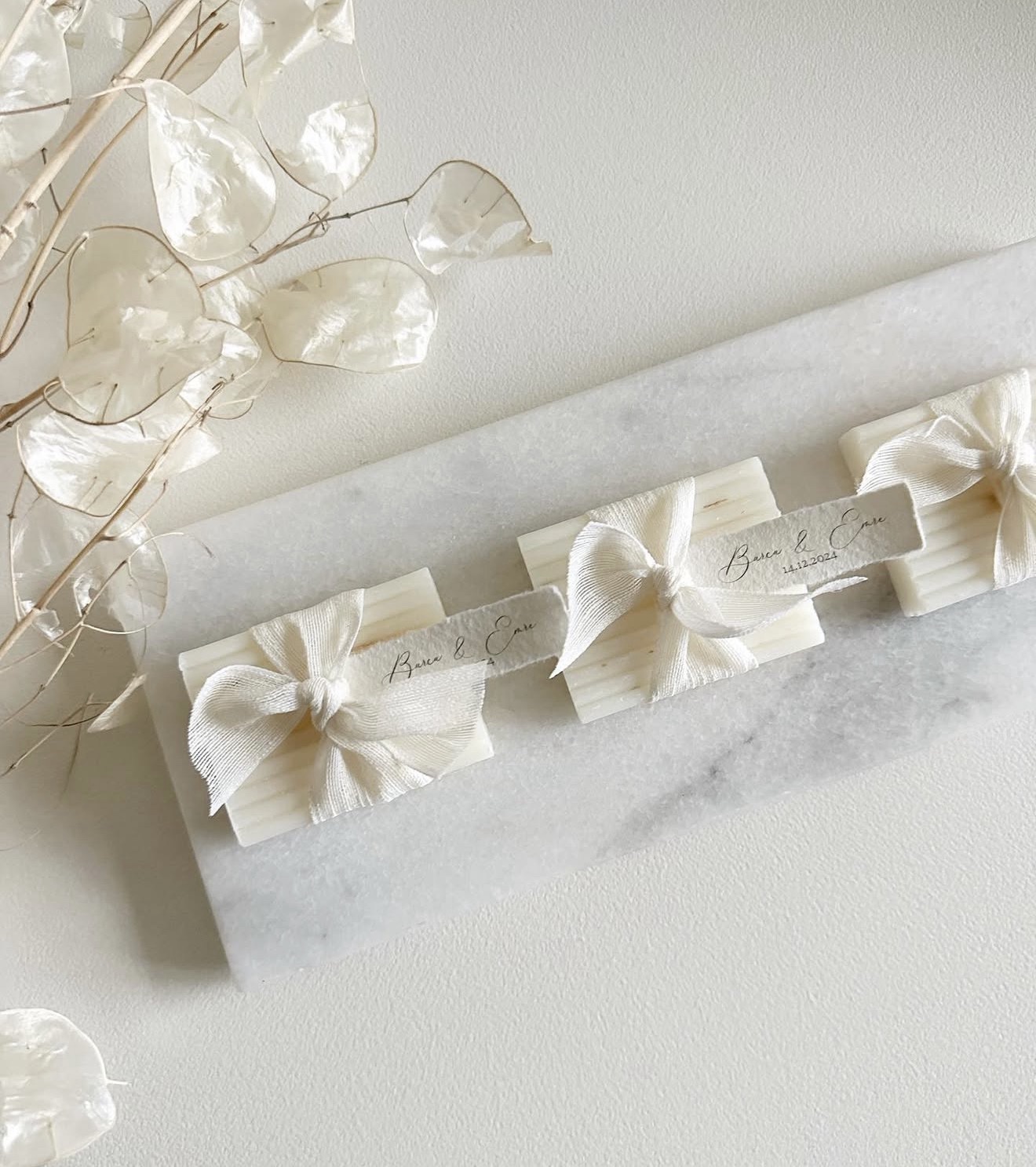 Mini white soaps nice as a thank you gift for the guests at your wedding or as a birth thank you for the visit