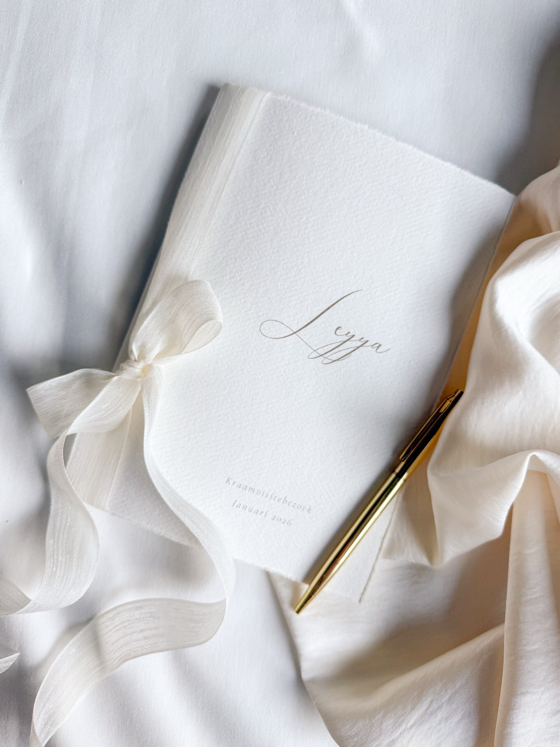 Een kraamvisiteboek dat ook te gebruiken is als fotoboek, waarin bezoekers foto’s van bijvoorbeeld een polaroid kunnen plakken en een persoonlijke boodschap kunnen achterlaten. Het boek is afgewerkt met een handgeschepte papieren omslag, wat zorgt voor een unieke en stijlvolle uitstraling.