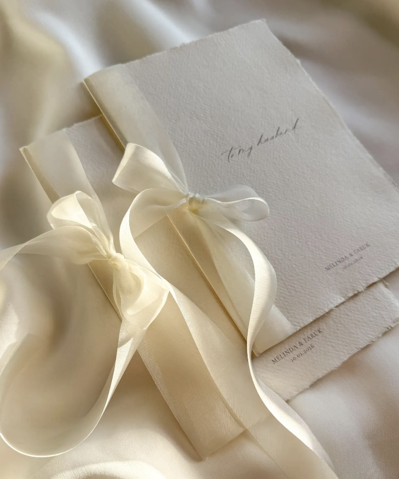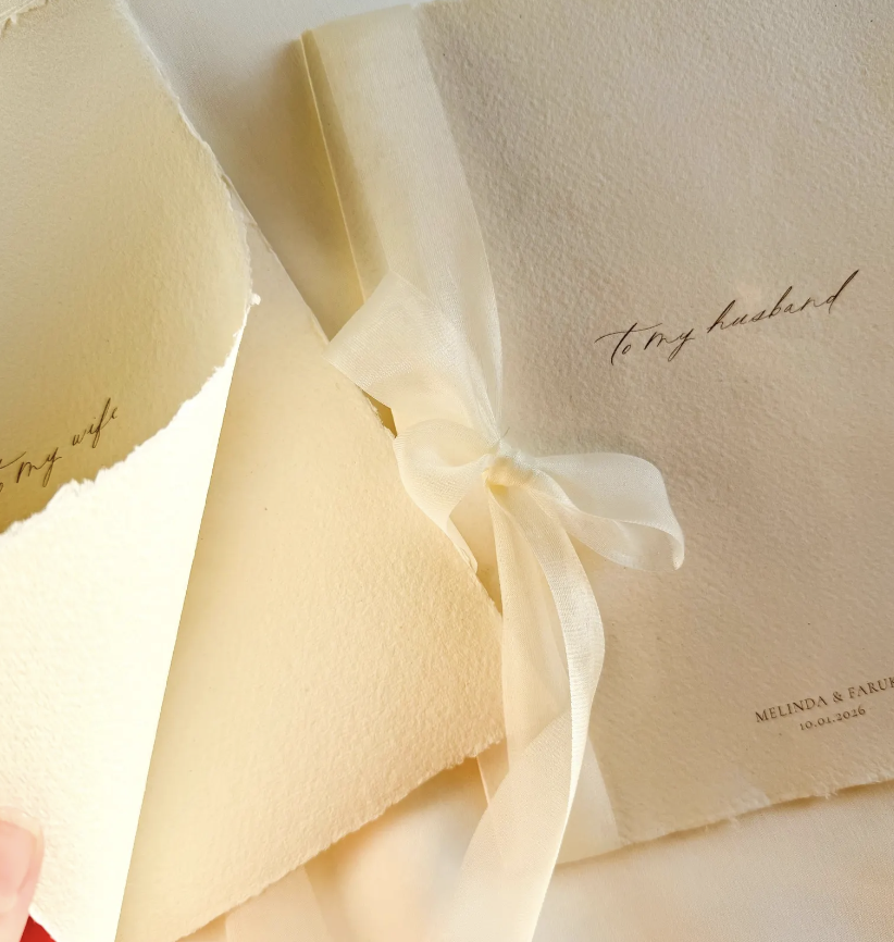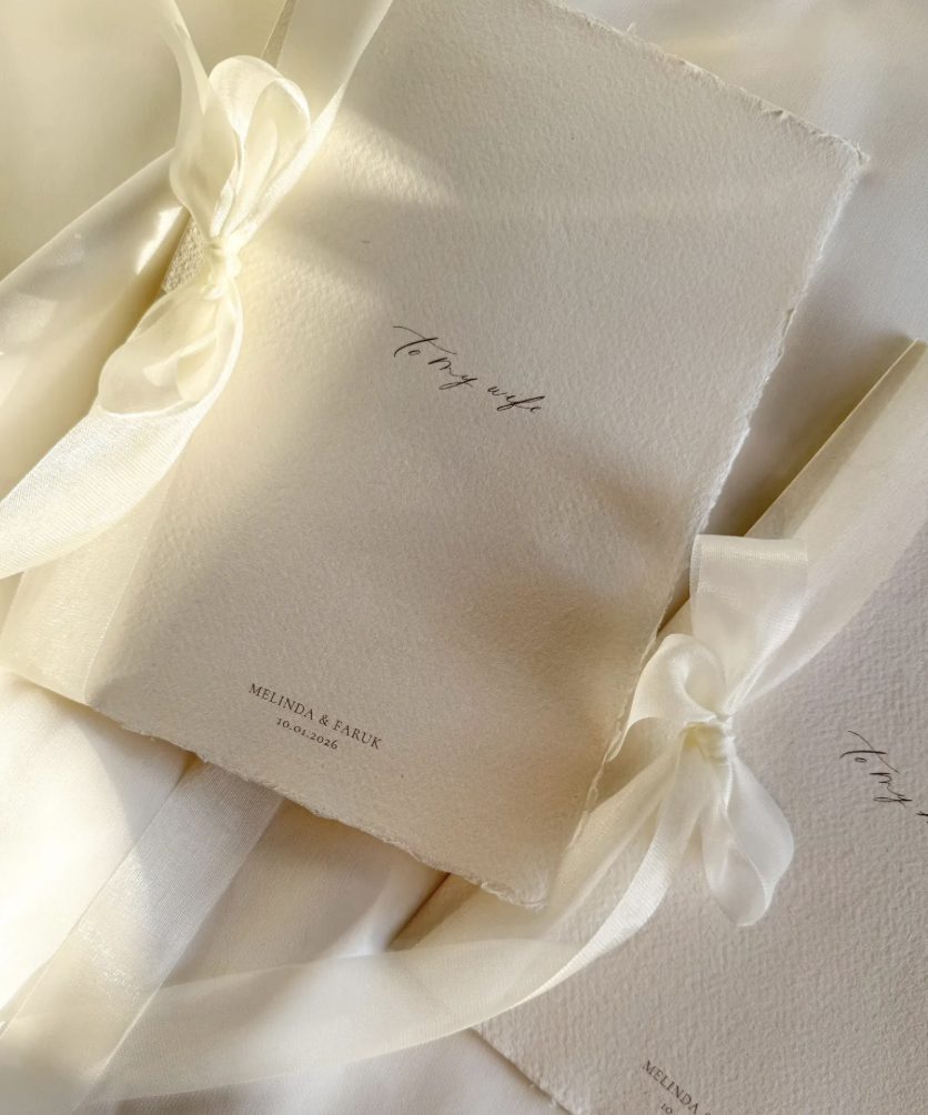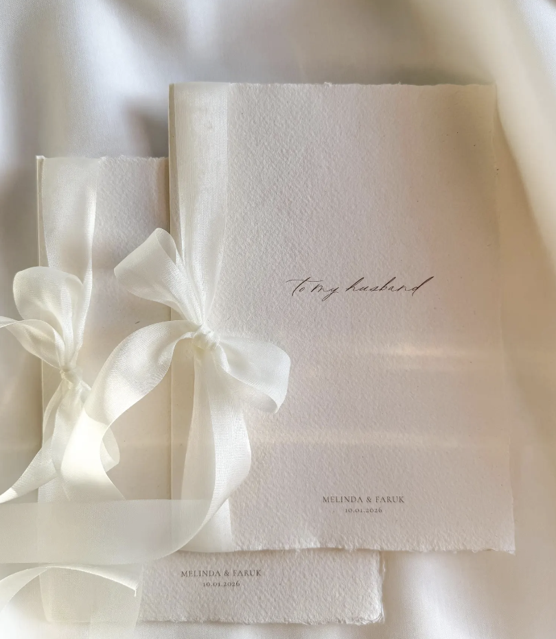 Make your wedding vows extra special with our elegant Vow Books Set of 2. Perfect for writing down your vows, these beautiful booklets feature a stylish center fold and a luxurious chiffon white ribbon. With a handy A5 size (148×210 mm), they fit easily into any wedding outfit. The writable inside provides ample space for personal, touching words celebrating your union. Add a touch of romance to your big day and preserve these precious memories in style! Perfect for brides who want to capture their love.