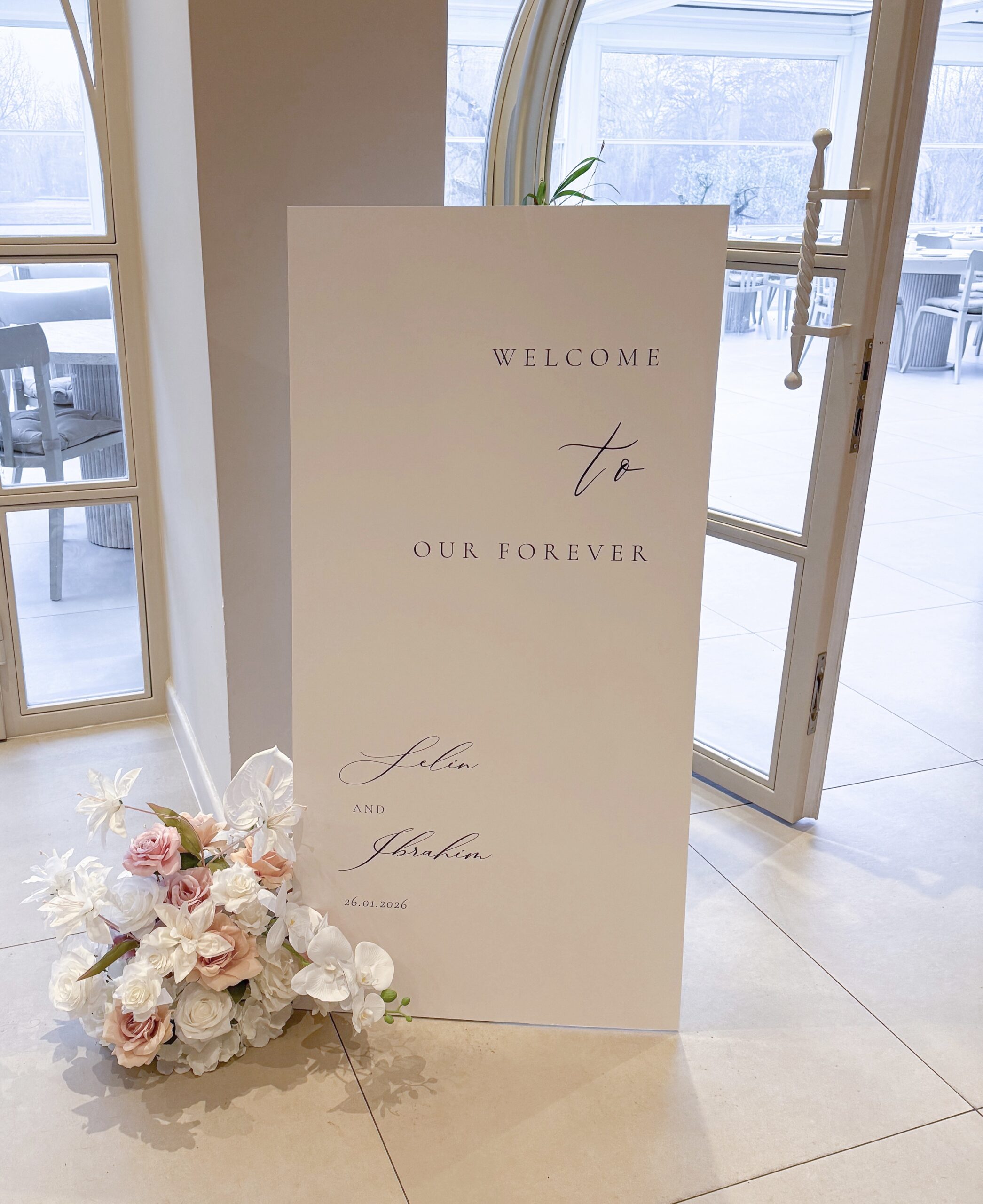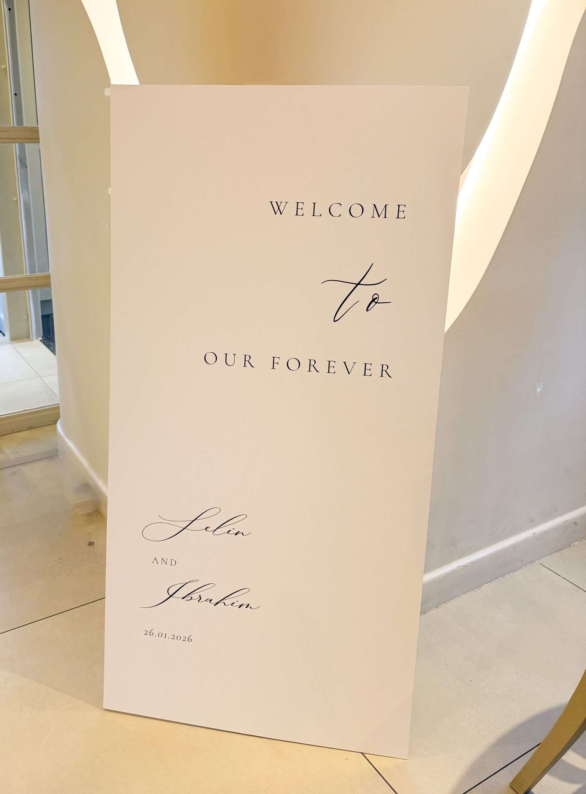 Dit elegante welkomstbord is de perfecte eyecatcher bij de entree van jullie verloving, bruiloft of ander bijzonder moment. Met zijn moderne en minimalistische uitstraling zorgt het bord voor een warme en stijlvolle ontvangst van jullie gasten. Ideaal voor wie op zoek is naar luxe welkomstborden met een persoonlijke touch.